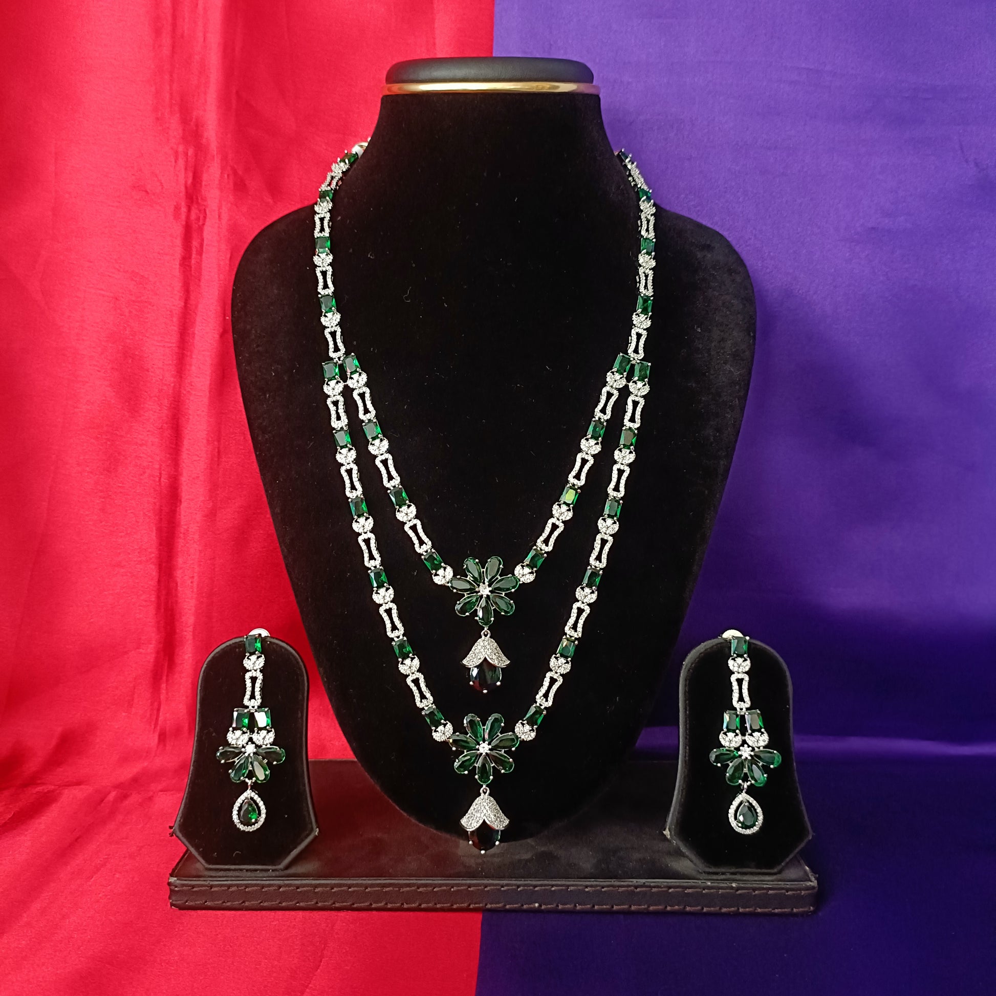 Elegant Silver Layered Long Necklace In Green Stone