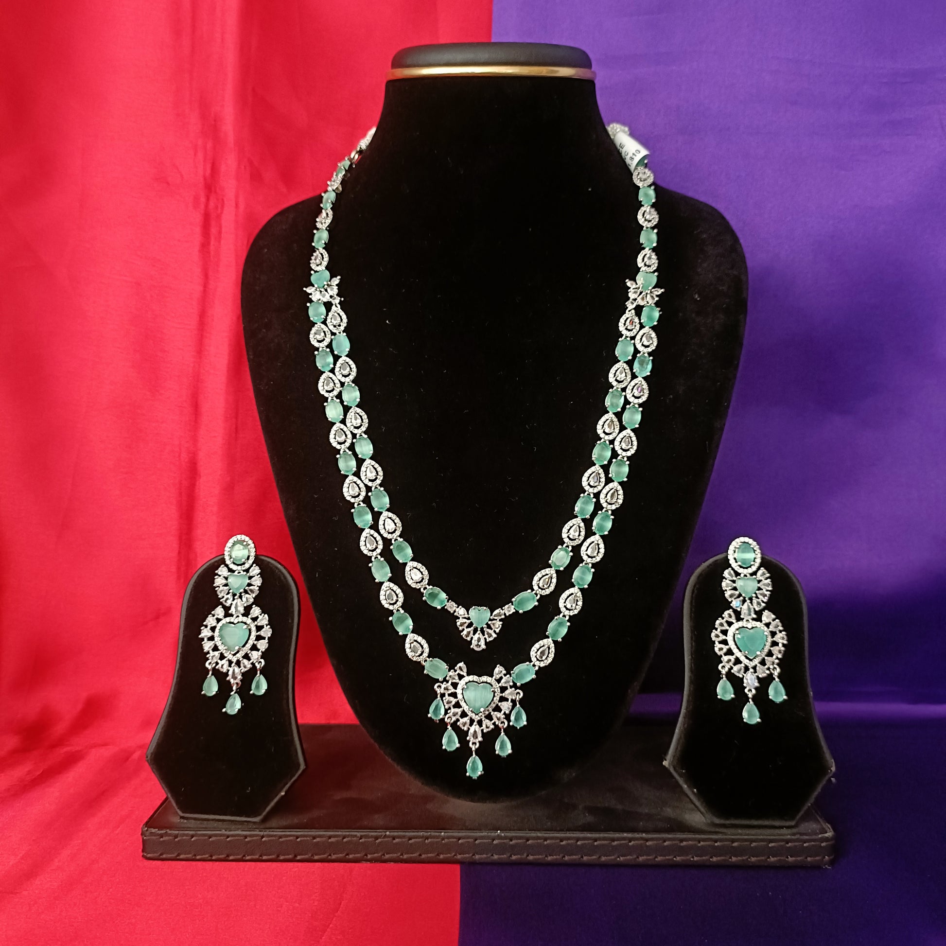 Elegant Silver Layered Long Necklace In Pista Green Stone