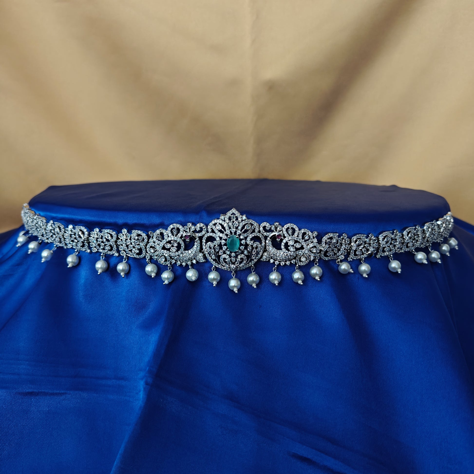 Beautiful Silver Chain Type Vaddanam In Pista Green Stone