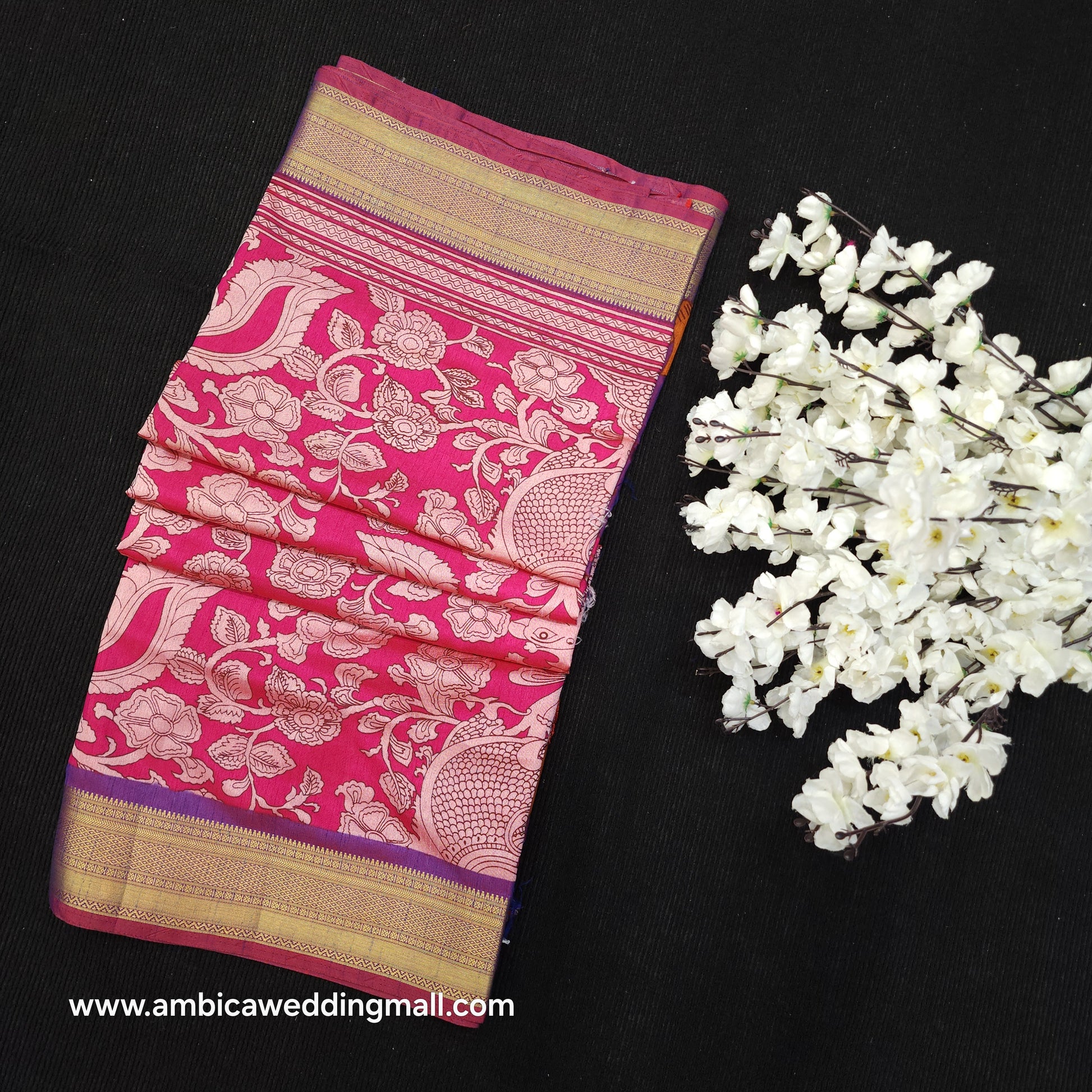 Kalamkari Fancy SareeThis elegant Kalamkari Fancy Saree showcases the unique hand-painted designs and intricate patterns of the Kalamkari technique. Made from high-quality materials, this saree offers both style and comfort for any occasion. Elevate your wardrobe with this traditional yet modern piece.